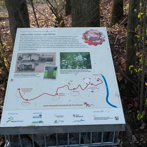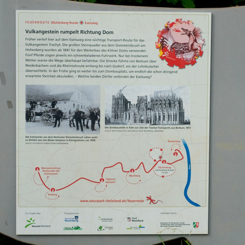 Das Symbol mit der Flamme weist euch den Weg auf der "Feuerroute". Die Route verbindet auf einer Strecke von 33 km sechs Stationen von Wachtberg bis Rheinbach, die Ausgangspunkte für spannende Entdeckungstouren sind. Sie sind durch Infostelen gekennzeichnet. Jede Stele ist mit Steinen aus verschiedenen Materialien befüllt. Jedes Material ist typisch für eine der sechs Stationen. Die Einstiegsorte sind mit dem ÖPNV sowie mit dem Pkw gut zu erreichen.