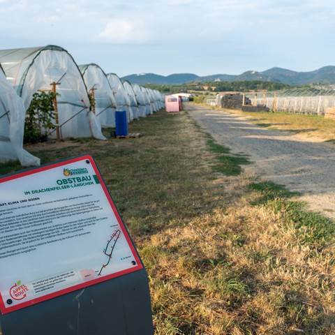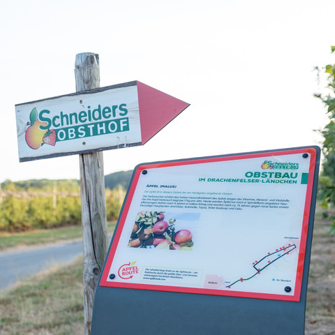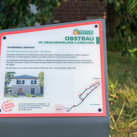 Bauernweg in Wachtberg zum Thema "Obstbau im Drachenfelser Ländchen" Direkt an der Rheinischen Apfelroute könnt ihr euch bei einem kurzen Spaziergang über den hiesigen Obstanbau informieren und dabei die wunderbare Aussicht auf das Siebengebirge genießen. Der sogenannte Bauernweg wurde vor einigen Jahren vom Schneiders Obsthof in Wachtberg initiiert und mit Informationstafeln zum Anbau vor Ort ausgestattet, so dass der Besucher auch direkt in der Natur sehen kann, was auf den Schildern erklärt wird. Der Bauernweg zum Obstbau im Drachenfelser Ländchen beginnt in Wachtberg-Berkum und kann bequem auf einer Strecke von rund 3 km erlaufen werden. Ihr kommt am 16 Schildern vorbei, die über die Landschaft und den Anbau sowie die verschiedenen Sorten informieren.